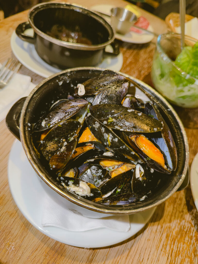 I ordered a massive bowl of Belgian mussels and steak frites, and let me tell you, I was hungry AF and it absolutely hit.