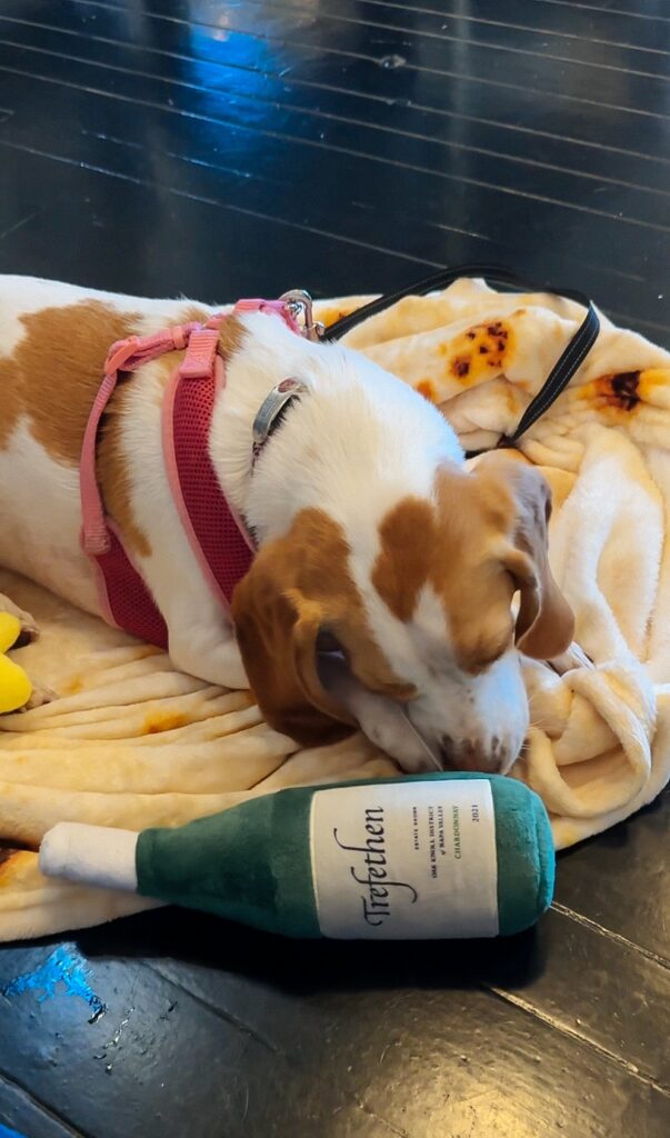 The best part? Bagel suckered us into buying her a Trefethen champagne bottle chew toy but it was 100% worth it 🍾
