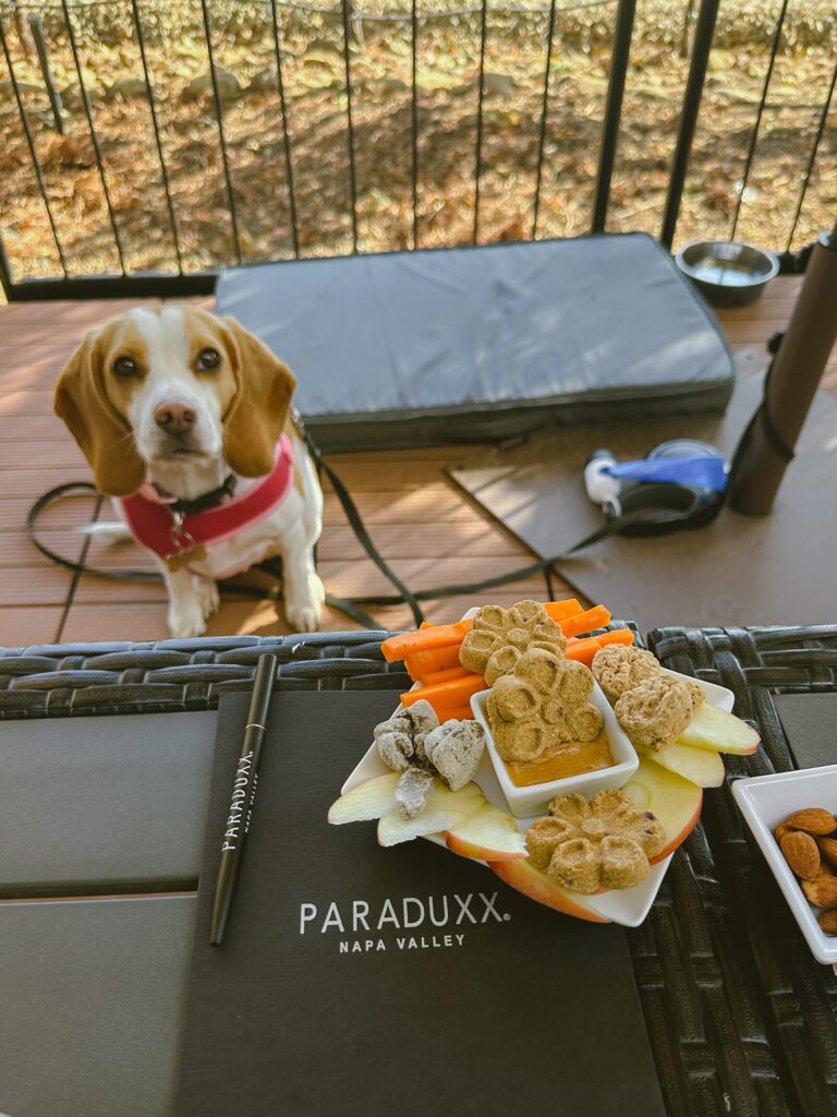 Your best bet? Eat beforehand or plan to dine at one of Napa’s fantastic outdoor dog-friendly restaurants like Brix, RH Yountville, Gott’s Roadside, The Charter Oak, Calistoga Depot, or countless other amazing spots.