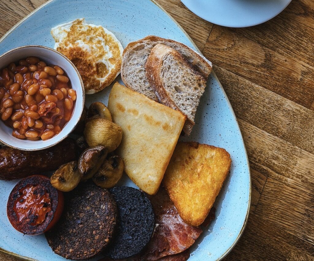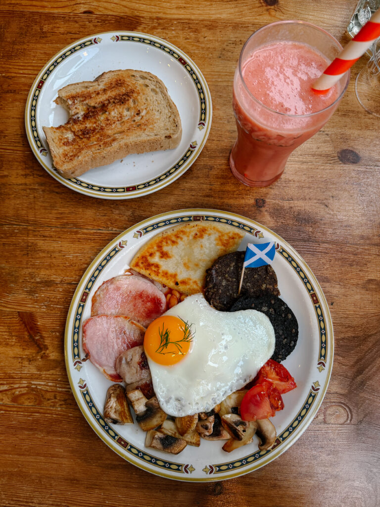 A proper Scottish breakfast usually comes stacked with eggs, bacon, sausage, black pudding, tattie scones, baked beans, mushrooms, and tomatoes. It’s hearty, filling, and absolutely meant to carry you through a full day of exploring.